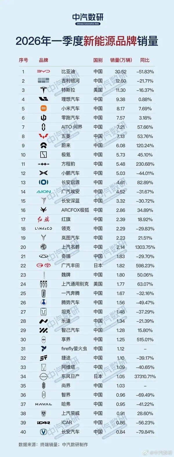【CNMO科技消息】4月16日,中汽数研发布了2026年一季度新能源品牌销量榜单。其中,比亚迪以30.52万辆的销量位居榜首,但同比下滑51.83%;吉利银河以12.60万辆位列第二,同比下降21.71%;特斯拉以11.30万辆排名第三,同比下降16.37%。