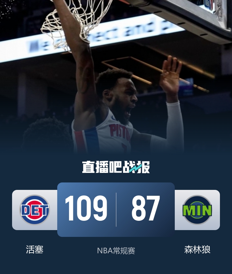 比赛开始,戈贝尔内线打得很主动,而托拜亚斯·哈里斯和邓罗接连外线回应,双方展开拉锯战,许尔特上来里突外投连砍7分建立主动权,首节活塞领先9分,次节活塞拉开双位数领先,迪文岑佐找到手感里突外投连砍11分咬住比分,双方各种打铁,半场活塞还领先5分。下半场,活塞7-0领先到双位数,迪文岑佐连续三分止血,但活塞牢牢掌握住10分以上领先,末节活塞替补齐发力近20分领先,随后双方逐渐换上替补练兵,最终活塞109-87轻取森林狼。