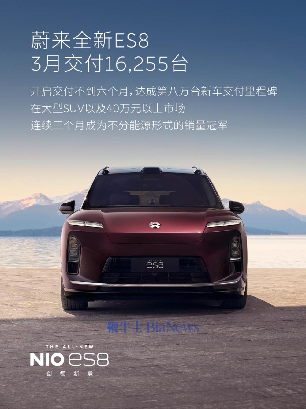 根据官方数据,仅ES8在3月份就交付16255辆,占据蔚来销量的半壁江山,是绝对的主力,表明在大型纯电SUV上,蔚来找到了属于自己的舒适区,根据网上消息,蔚来ES9也已经在发布的路上,很快就要和市场见面。